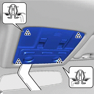 | (a) Tourner les 2 douilles d'éclairage de lecture avec les 2 ampoules d'éclairage de lecture comme indiqué sur le schéma afin de déposer l'ensemble. |