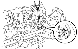 | (c) A l'aide d'un tournevis, soulever légèrement le connecteur d'actionneur de commande de levée de soupape pour créer un espace entre l'ensemble de dispositif de commande de levée de soupape à variation continue et le sous-ensemble de carter d'arbre à cames. REMARQUE: