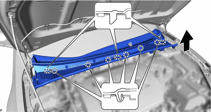 (c) Libérer les 8 guides et déposer le sous-ensemble de grille de ventilation de dessus d'auvent comme indiqué sur le schéma.