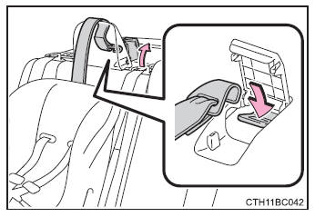 4. Plaquez le siège de sécurité enfant contre le dossier de siège arrière, et laissez la sangle diagonale s'enrouler jusqu'à ce que le siège de sécurité enfant soit bien bloqué en place.