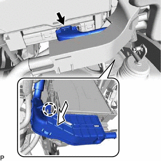 | (c) Tout en maintenant l'ECU de carrosserie principale (ECU de carrosserie du réseau multiplex) en contact avec le côté A de l'ensemble de bloc de jonction côté conducteur (axe de rotation), l'abaisser, comme indiqué sur le schéma. |