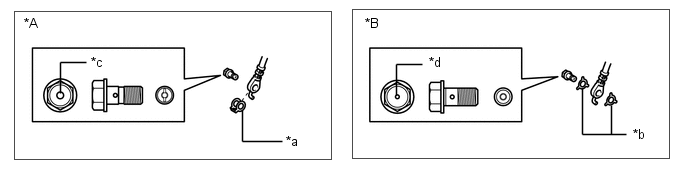 | (d) Reposer le flexible avant sur le support d'amortisseur avec le boulon. Torque: 29 N·m {296 kgf·cm, 21 ft·lbf} REMARQUE: Le boulon serre le flexible avant et le capteur de vitesse avant. S'assurer que le flexible se trouve au-dessus du capteur de vitesse avant. |